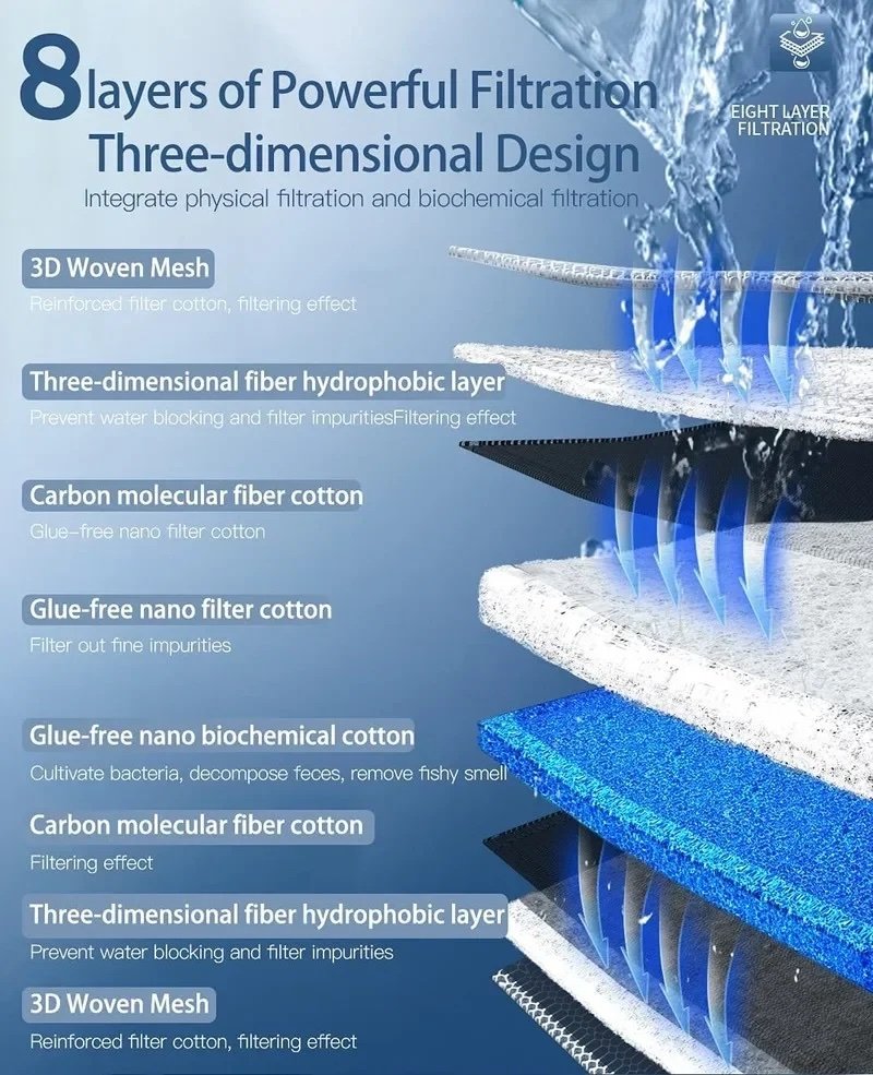 The 8D Aquarium Filter Sponge is a high-quality, multi-layered sponge filter media designed to provide excellent mechanical and biological filtration. Its unique porous structure traps debris while offering ample surface area for beneficial bacteria to colonize, ensuring clean and healthy water for aquariums.